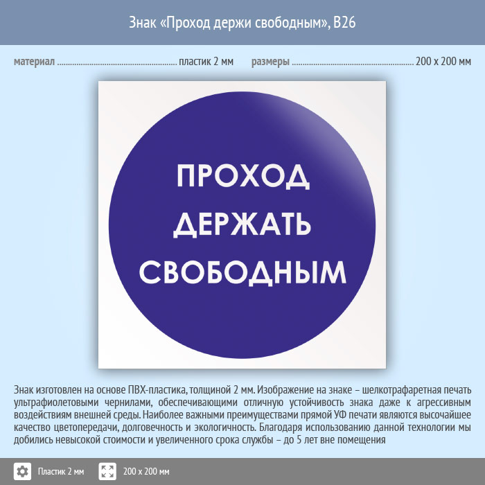 Знак «Проход держи свободным», B26 (пластик, 200х200 мм) в Хотьково купить