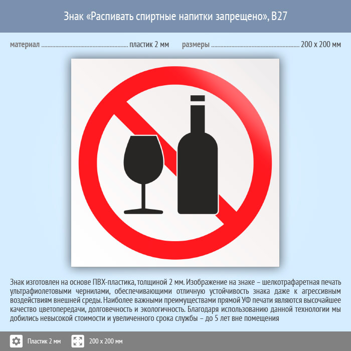 Знак «Распивать спиртные напитки запрещено», B27 (пластик, 200х200 мм) в Хотьково купить