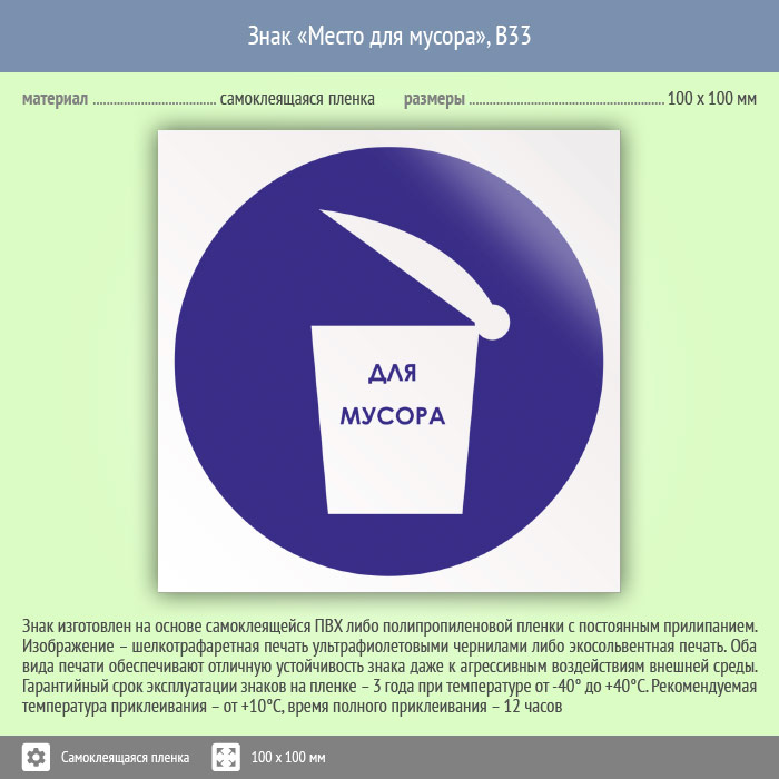 Знак «Место для мусора», B33 (пленка, 100х100 мм) в Хотьково купить