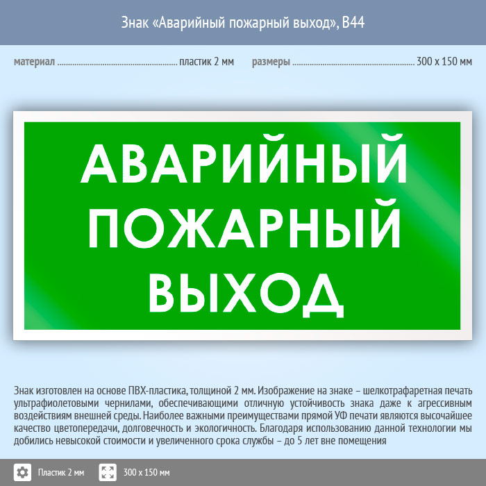Знак «Аварийный пожарный выход», B44 (пластик, 300х150 мм) в Хотьково купить