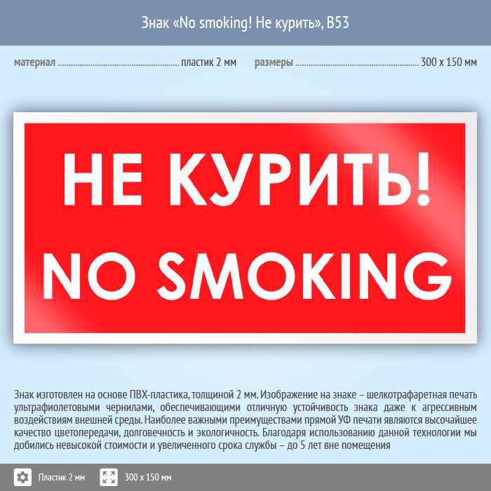 Знак «No smoking! Не курить», B53 (пластик, 300х150 мм) в Хотьково купить