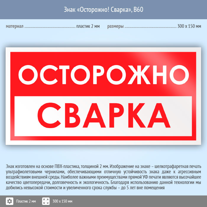 Знак «Осторожно! Сварка», B60 (пластик, 300х150 мм) в Хотьково купить