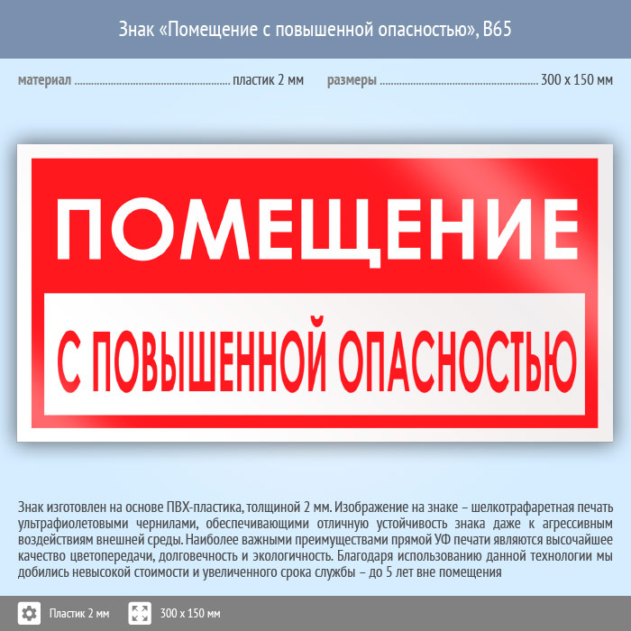 Знак «Помещение с повышенной опасностью», B65 (пластик, 300х150 мм) в Хотьково купить