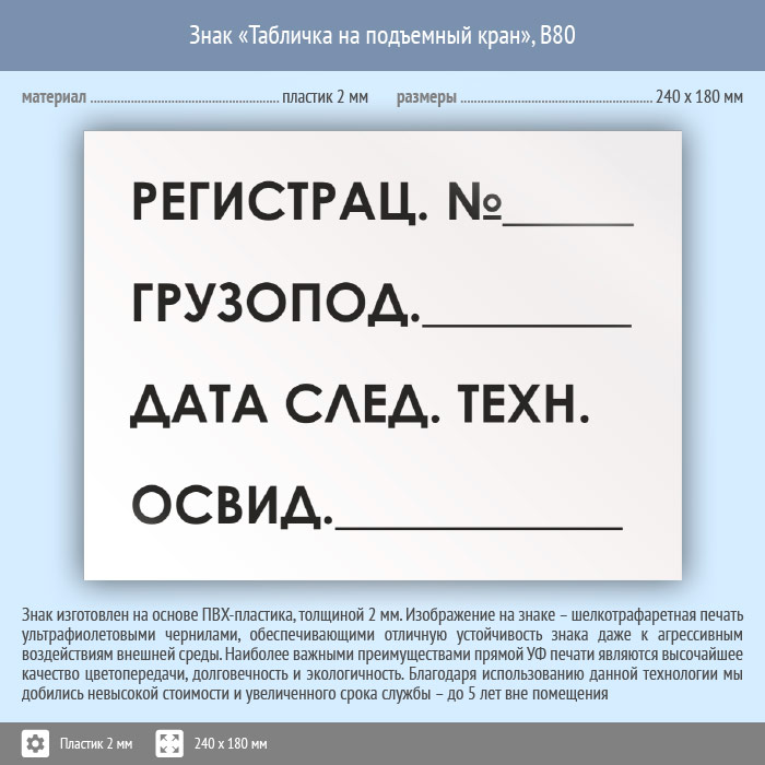 Знак «Табличка на подъемный кран», B80 (пластик, 240х180 мм) в Хотьково купить