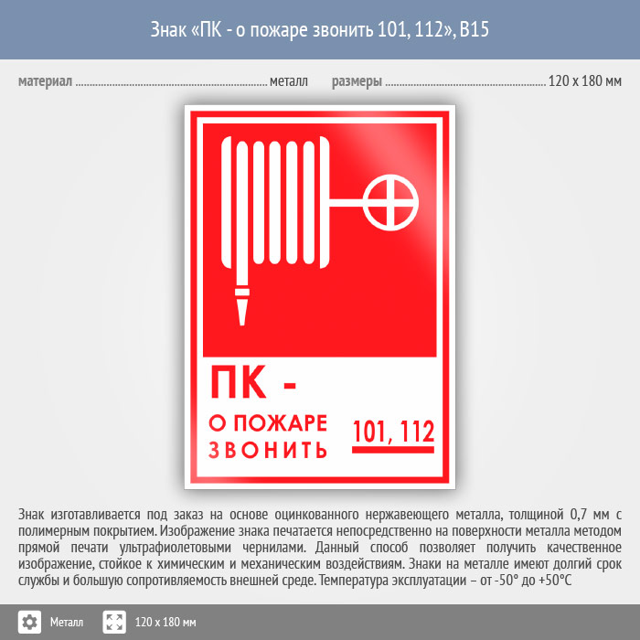 Знак «ПК - о пожаре звонить 101, 112», B15 (металл, 120х180 мм) в Хотьково купить