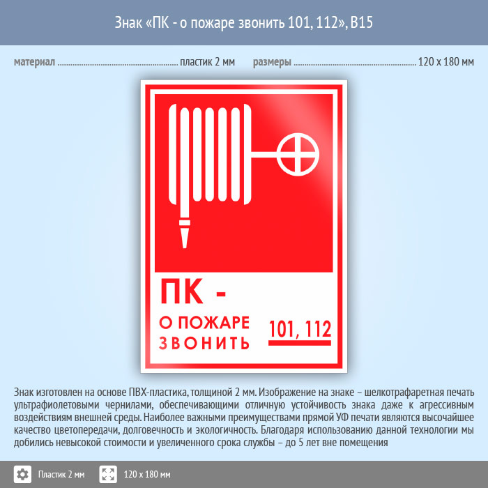 Знак «ПК - о пожаре звонить 101, 112», B15 (пластик, 120х180 мм) в Хотьково купить