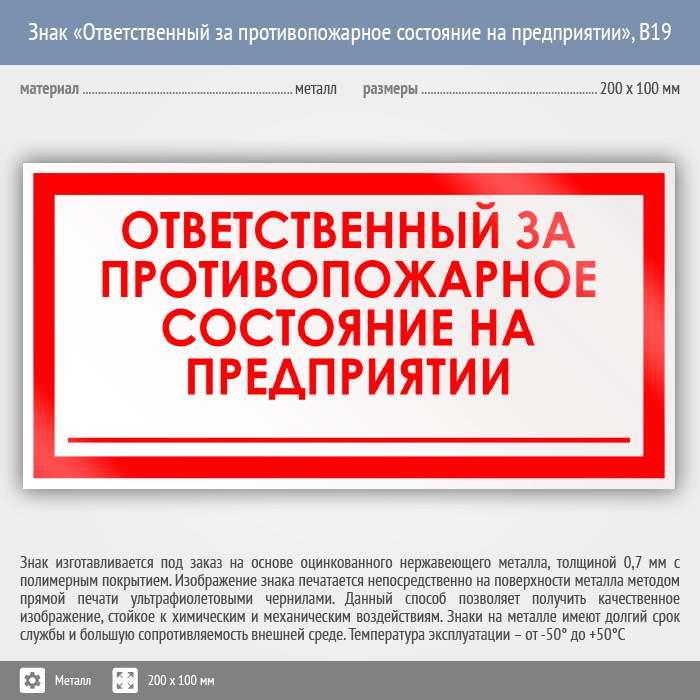 Знак «Ответственный за противопожарное состояние на предприятии», B19 (металл, 200х100 мм) в Хотьково купить