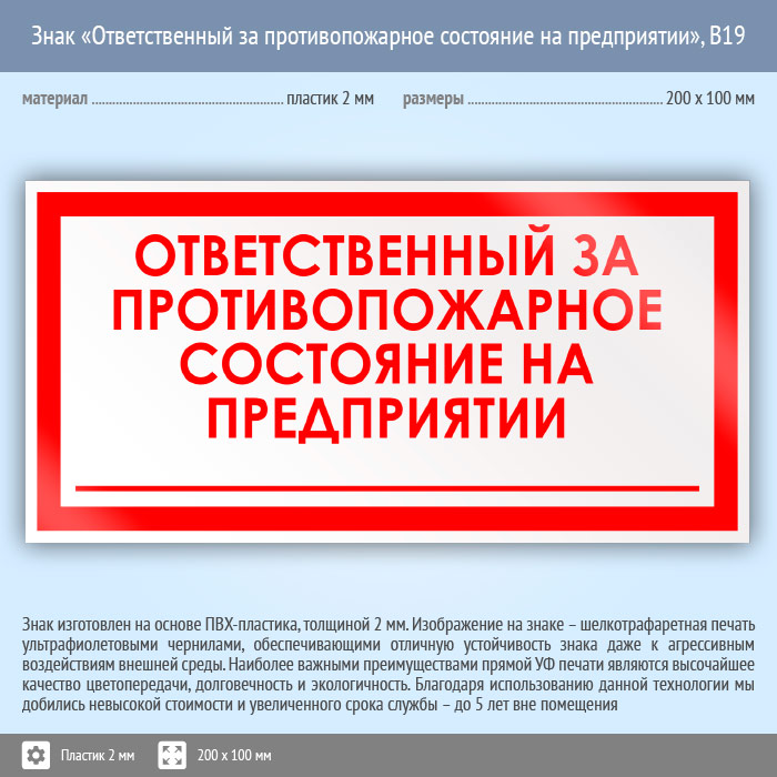 Знак «Ответственный за противопожарное состояние на предприятии», B19 (пластик, 200х100 мм) в Хотьково купить