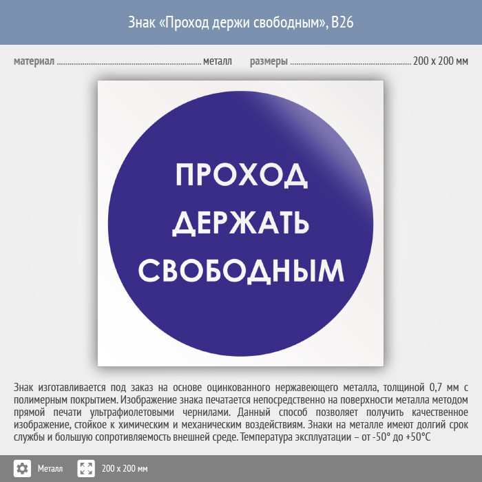Знак «Проход держи свободным», B26 (металл, 200х200 мм) в Хотьково купить