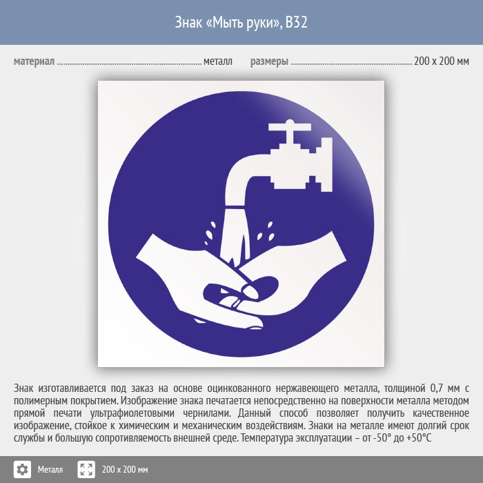 Знак «Мыть руки», B32 (металл, 200х200 мм) в Хотьково купить