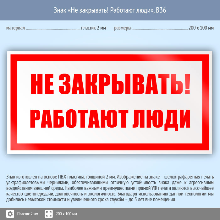 Знак «Не закрывать! Работают люди», B36 (пластик, 200х100 мм) в Хотьково купить