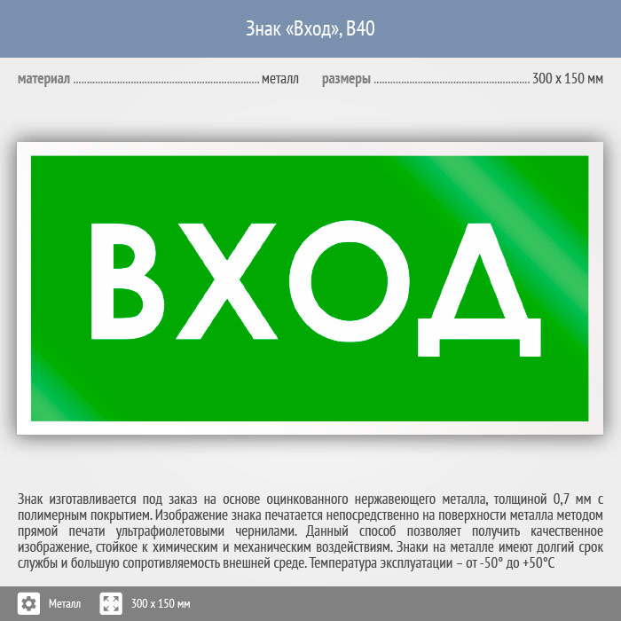 Знак «Вход», B40 (металл, 300х150 мм) в Хотьково купить