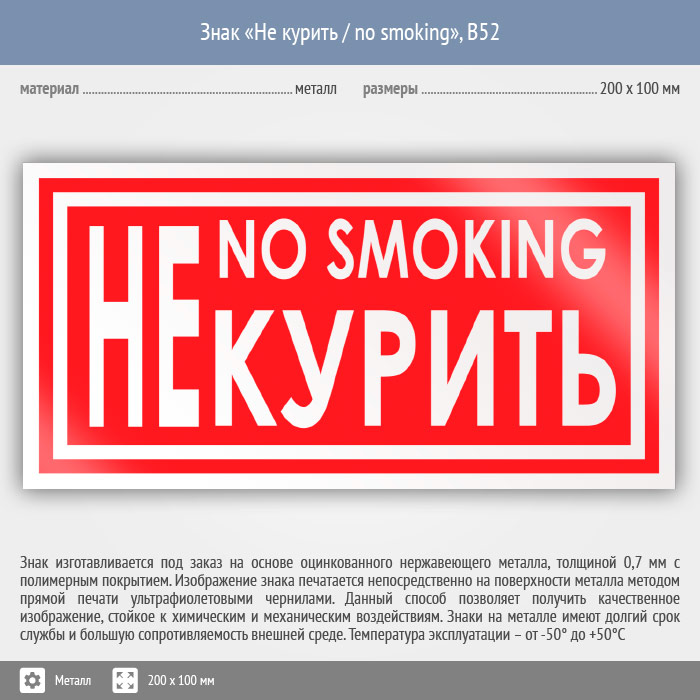 Знак «Не курить / no smoking», B52 (металл, 200х100 мм) в Хотьково купить
