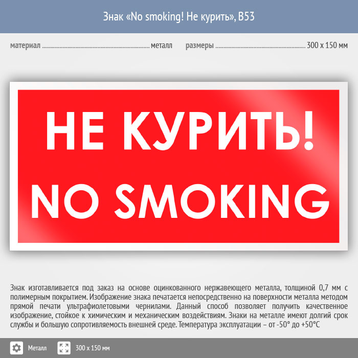 Знак «No smoking! Не курить», B53 (металл, 300х150 мм) в Хотьково купить