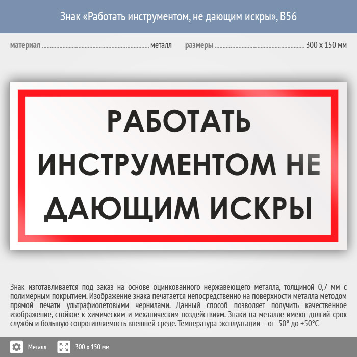 Знак «Работать инструментом, не дающим искры», B56 (металл, 300х150 мм) в Хотьково купить