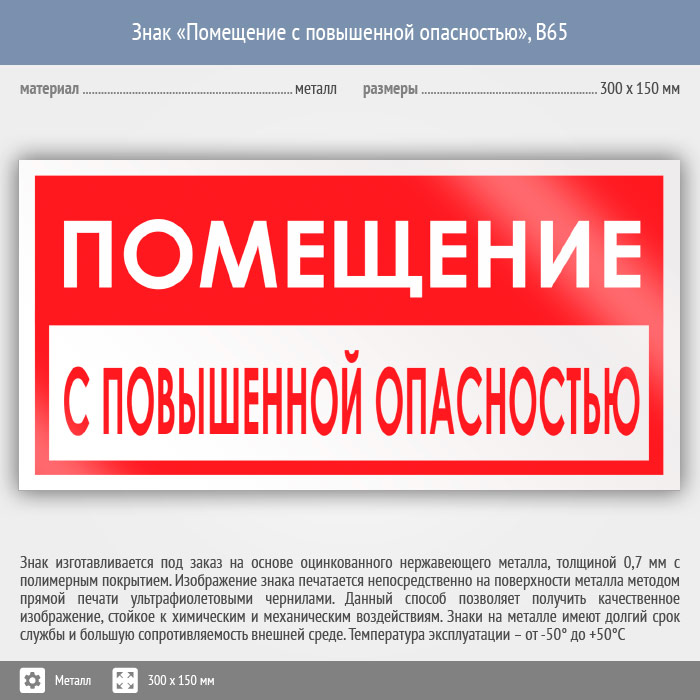 Знак «Помещение с повышенной опасностью», B65 (металл, 300х150 мм) в Хотьково купить