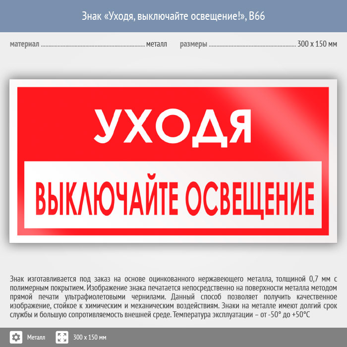 Знак «Уходя, выключайте освещение!», B66 (металл, 300х150 мм) в Хотьково купить