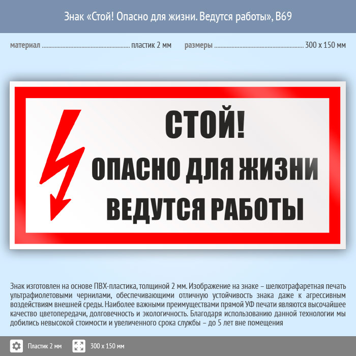 Знак «Стой! Опасно для жизни. Ведутся работы», B69 (пластик, 300х150 мм) в Хотьково купить