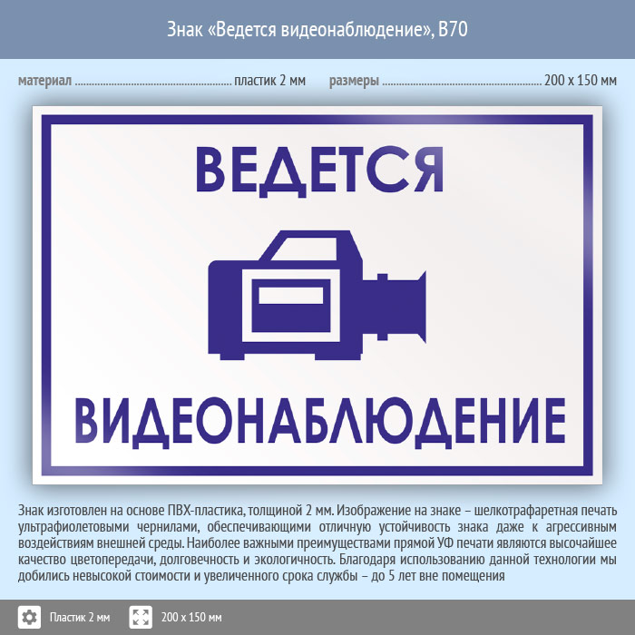Знак «Ведется видеонаблюдение», B70 (пластик, 200х150 мм) в Хотьково купить