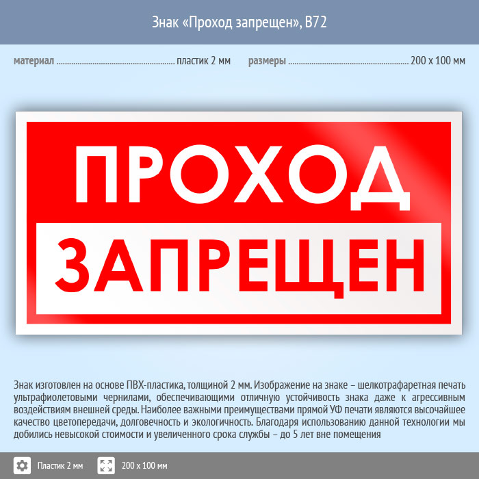 Знак «Проход запрещен», B72 (пластик, 200х100 мм) в Хотьково купить