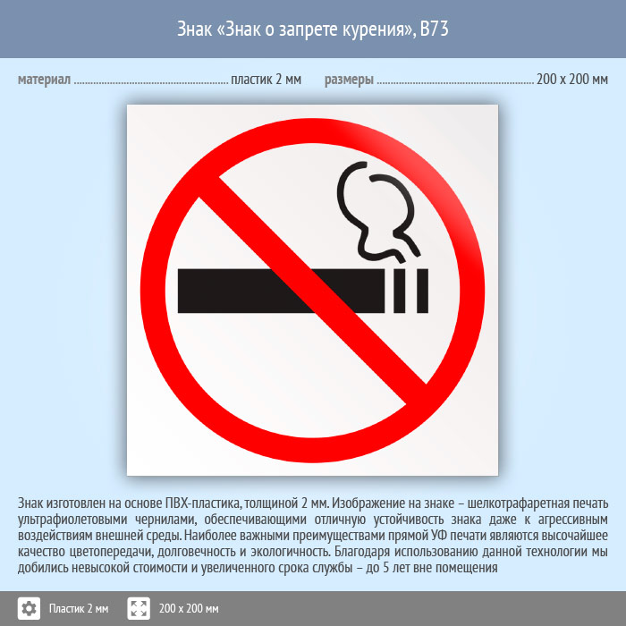 Знак «Знак о запрете курения», B73 (пластик, 200х200 мм) в Хотьково купить