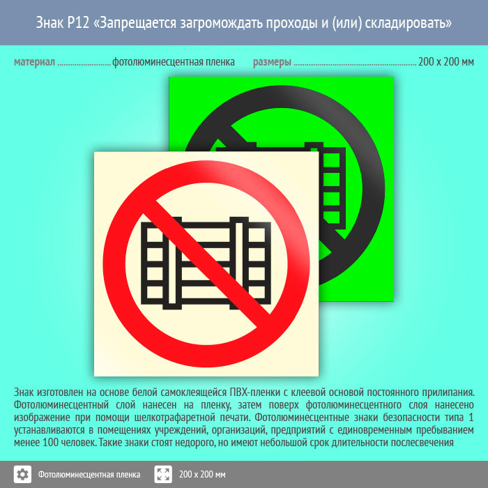 Знак P12 «Запрещается загромождать проходы и (или) складировать» (фотолюминесцентная пленка, 200х200 мм) в Хотьково купить
