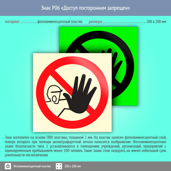 Знак P06 «Доступ посторонним запрещен» (фотолюминесцентный пластик, 200х200 мм) в Хотьково купить