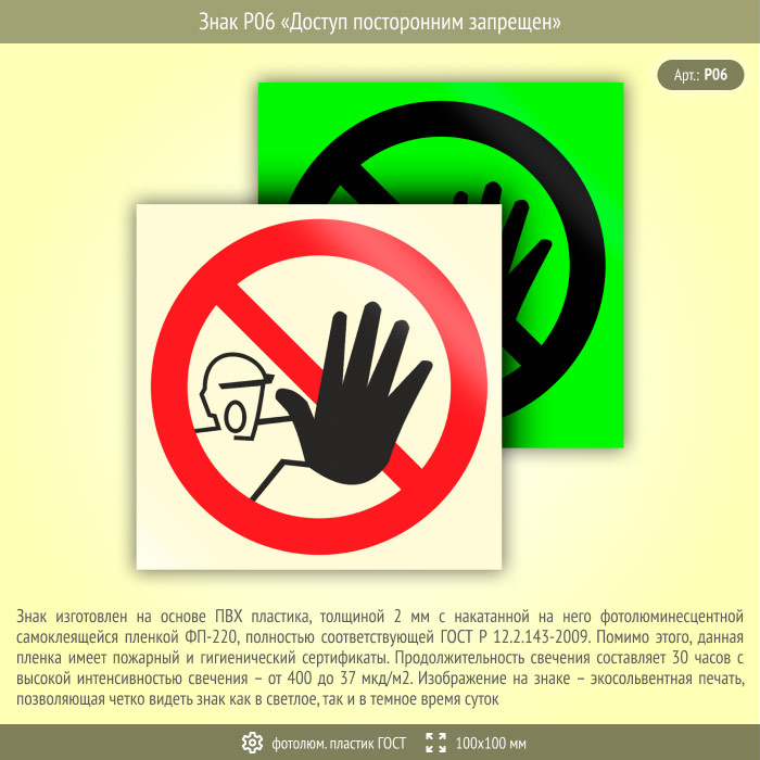 Знак P06 «Доступ посторонним запрещен» (фотолюминесцентный пластик ГОСТ 34428-2018, 100х100 мм) в Хотьково купить