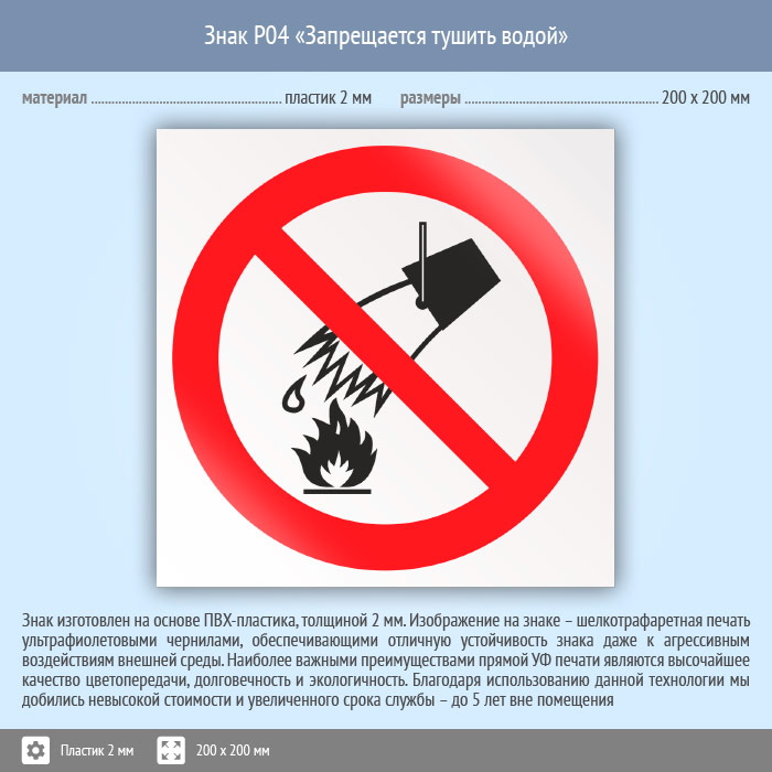 Знак P04 «Запрещается тушить водой» (пластик, 200х200 мм) в Хотьково купить