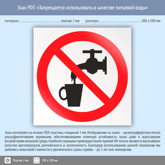 Знак P05 «Запрещается использовать в качестве питьевой воды» (пластик, 200х200 мм) в Хотьково купить