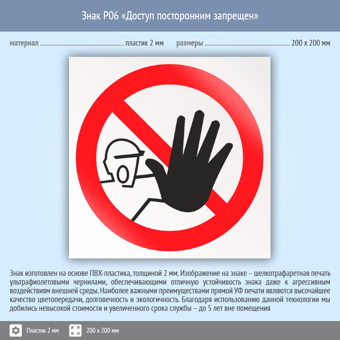 Знак P06 «Доступ посторонним запрещен» (пластик, 200х200 мм) в Хотьково купить