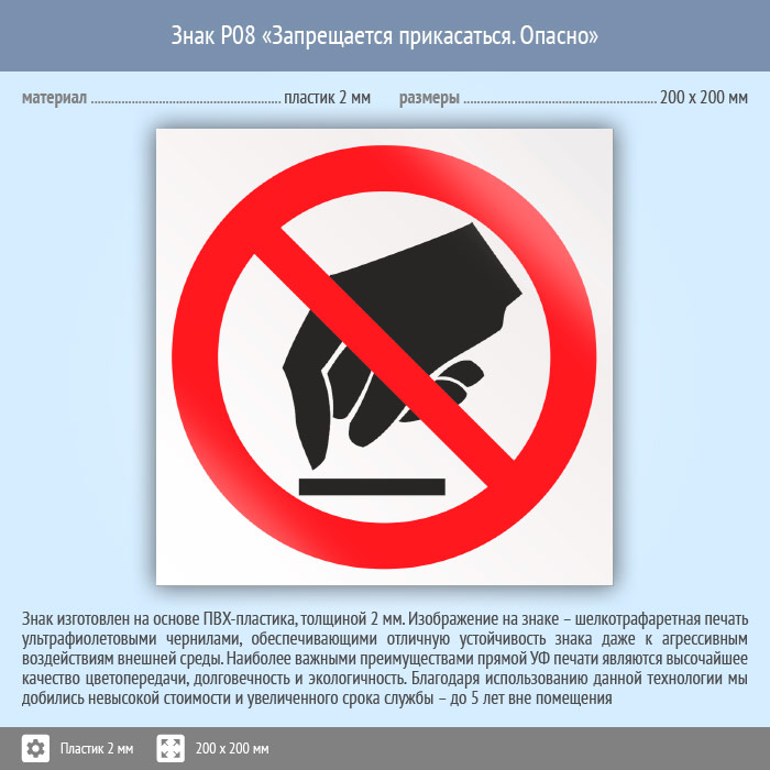 Знак P08 «Запрещается прикасаться. Опасно» (пластик, 200х200 мм) в Хотьково купить