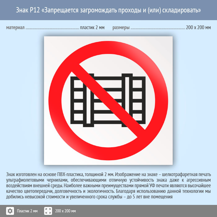 Знак P12 «Запрещается загромождать проходы и (или) складировать» (пластик, 200х200 мм) в Хотьково купить