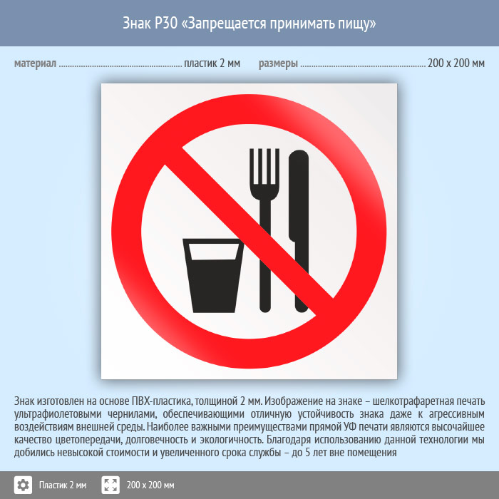 Знак P30 «Запрещается принимать пищу» (пластик, 200х200 мм) в Хотьково купить