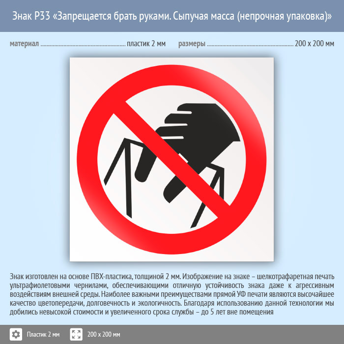 Знак P33 «Запрещается брать руками. Сыпучая масса (непрочная упаковка)» (пластик, 200х200 мм) в Хотьково купить