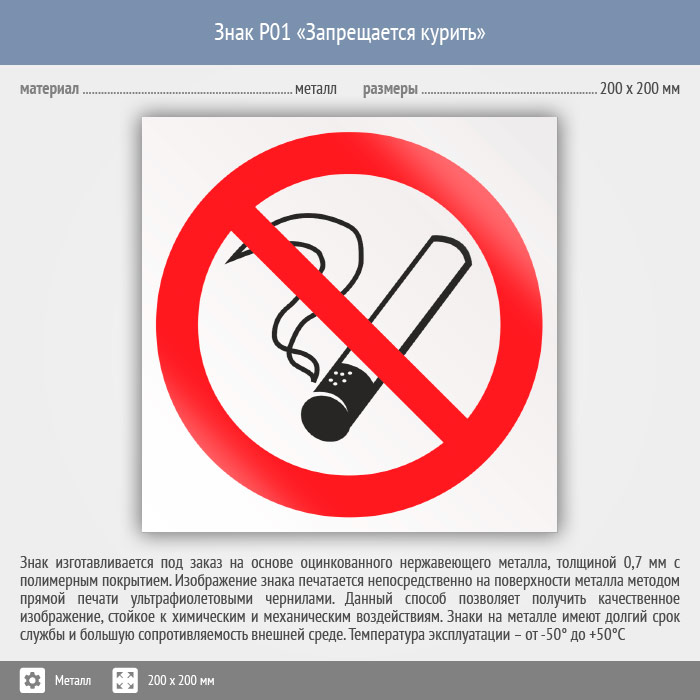 Знак P01 «Запрещается курить» (металл, 200х200 мм) в Хотьково купить