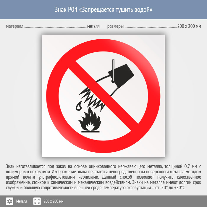 Знак P04 «Запрещается тушить водой» (металл, 200х200 мм) в Хотьково купить