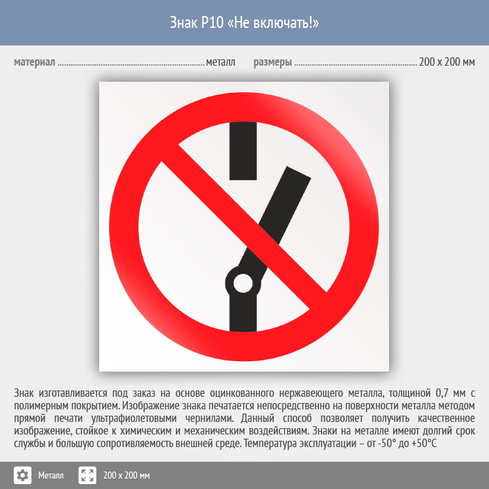 Знак P10 «Не включать!» (металл, 200х200 мм) в Хотьково купить