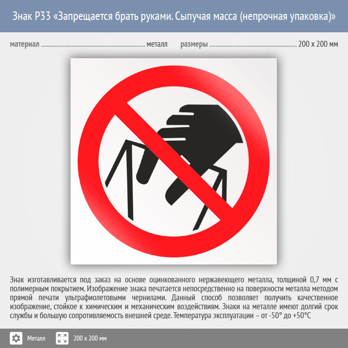 Знак P33 «Запрещается брать руками. Сыпучая масса (непрочная упаковка)» (металл, 200х200 мм) в Хотьково купить