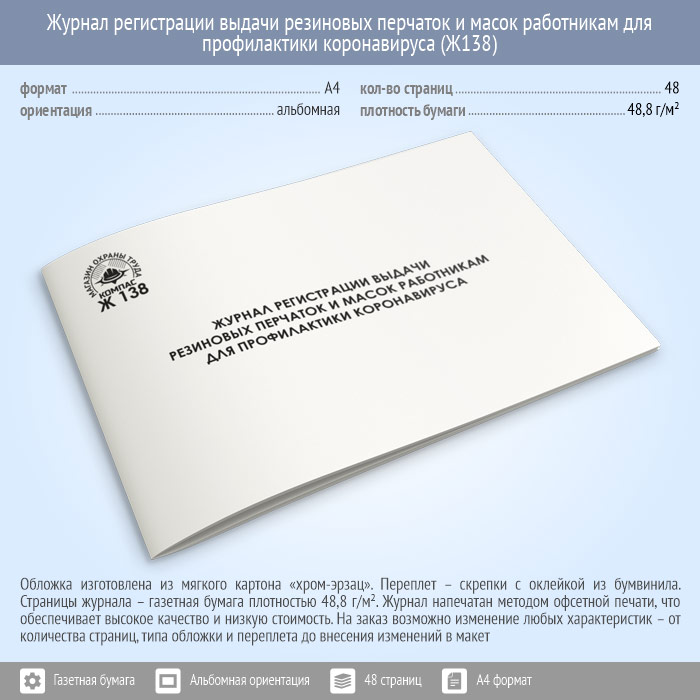 Журнал регистрации выдачи резиновых перчаток и масок работникам для профилактики коронавируса (48 стр., Ж138) в Хотьково купить