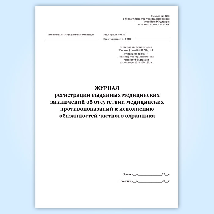 Журнал регистрации выданных медицинских заключений об отсутствии медицинских противопоказаний к исполнению обязанностей частного охранника (учетная форма № 002-ЧО/у-10) в Хотьково купить