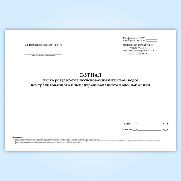 Журнал учета результатов исследований питьевой воды централизованного и нецентрализованного водоснабжения (форма 326-у) в Хотьково купить