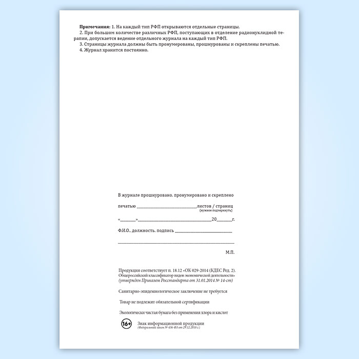 Приходно-расходный журнал учета радиофармпрепаратов, поступающих в подразделение радионуклидной терапии в готовом виде для непосредственного введения в организм пациента в Хотьково купить