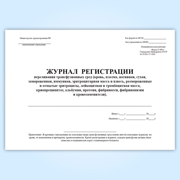 Журнал регистрации переливания трансфузионных сред (форма 009/у) в Хотьково купить