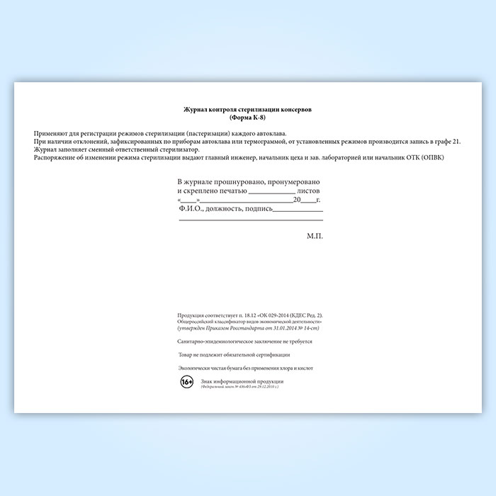Журнал контроля стерилизации консервов (форма К-8) в Хотьково купить
