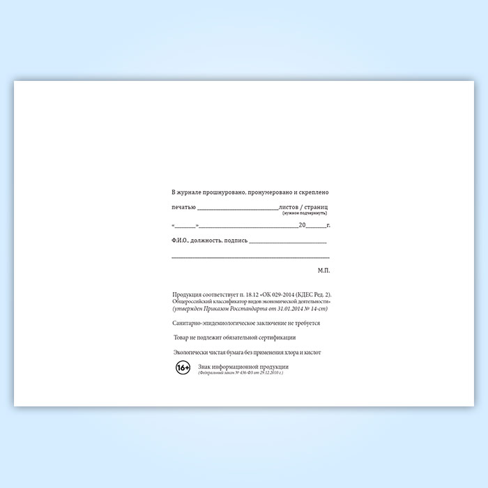 Вы получаете печатную продукцию прошнурованной и c местом для вашей печати в соответствии с действующими нормативными документами: