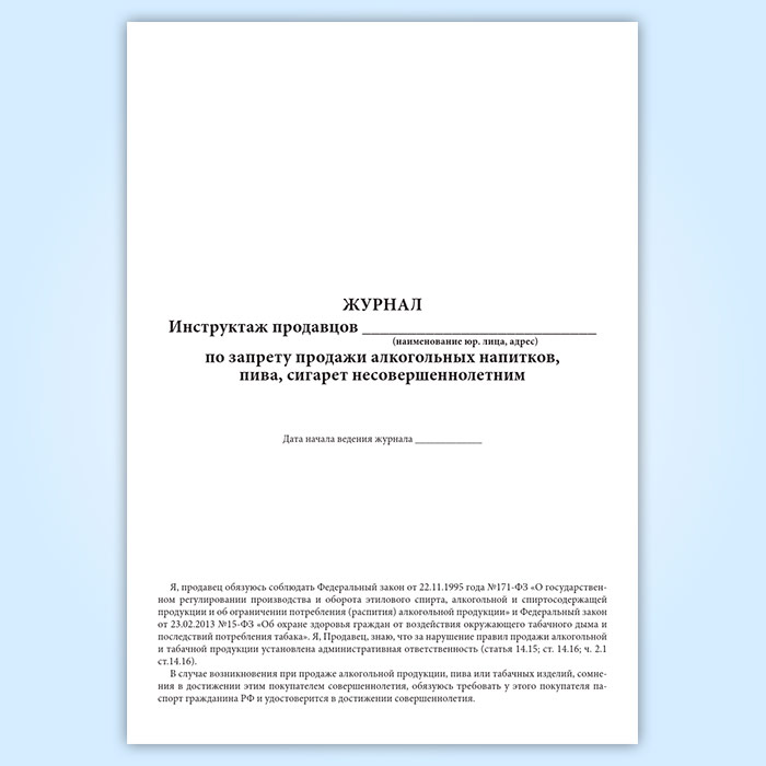 Журнал инструктажа продавцов по запрету продажи алкогольных напитков, пива, сигарет несовершеннолетним в Хотьково купить