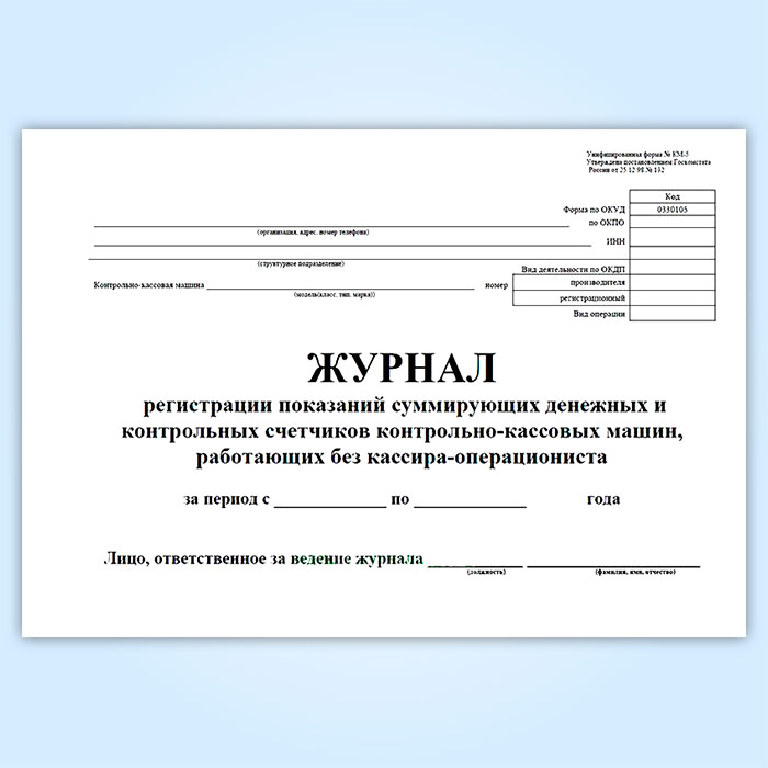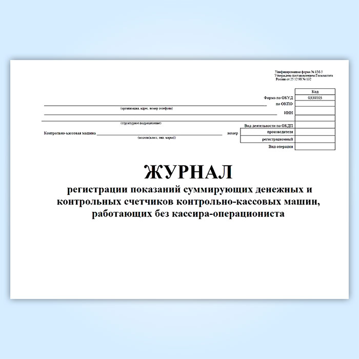 Журнал регистрации показаний суммирующих денежных и контрольных счетчиков контрольно-кассовых машин, работающих без кассира-операциониста (форма КМ-5) в Хотьково купить