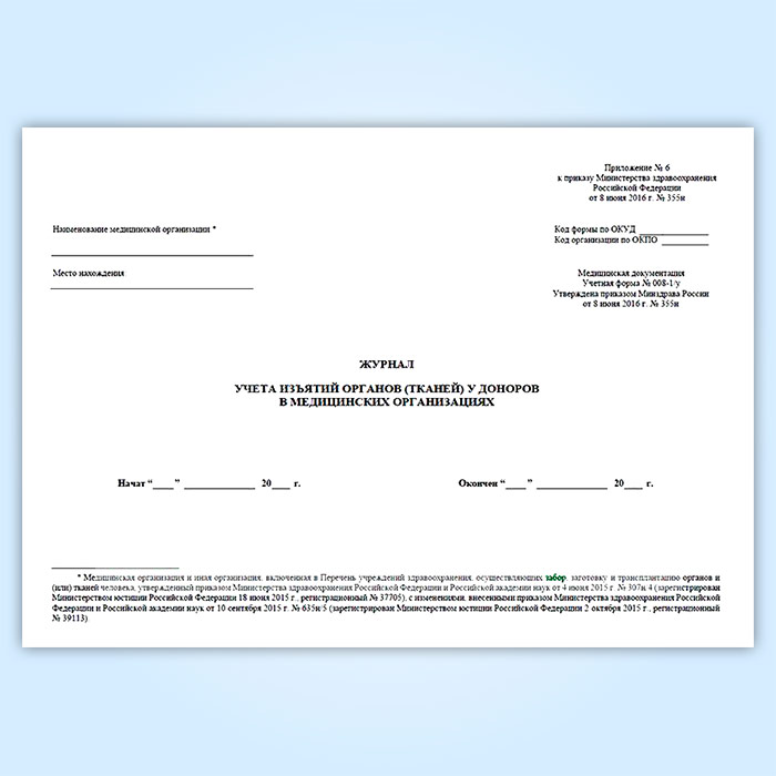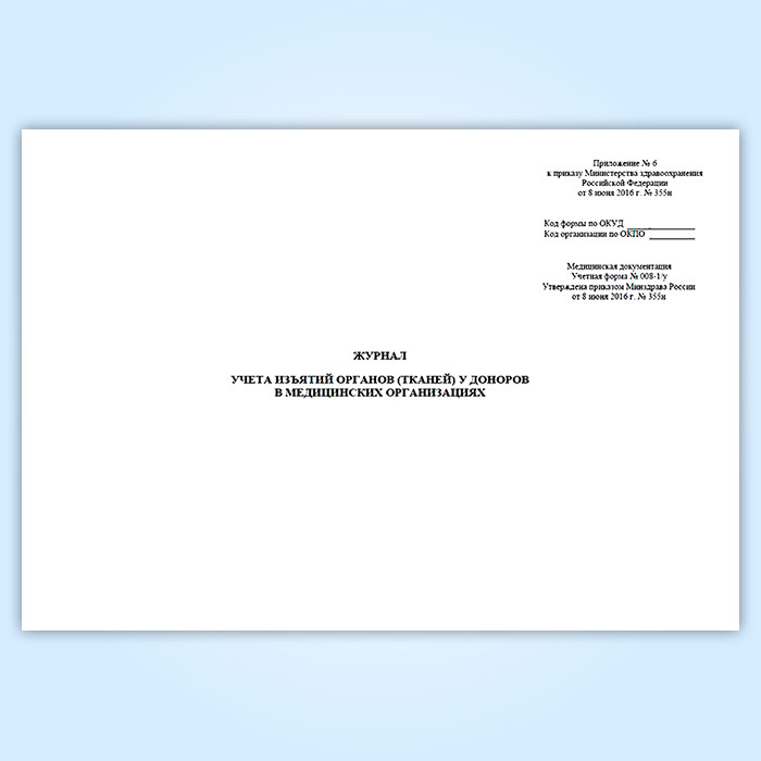Журнал учета изъятий органов (тканей) у доноров в медицинских организациях (форма № 008-1/у) в Хотьково купить