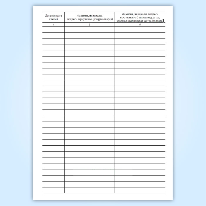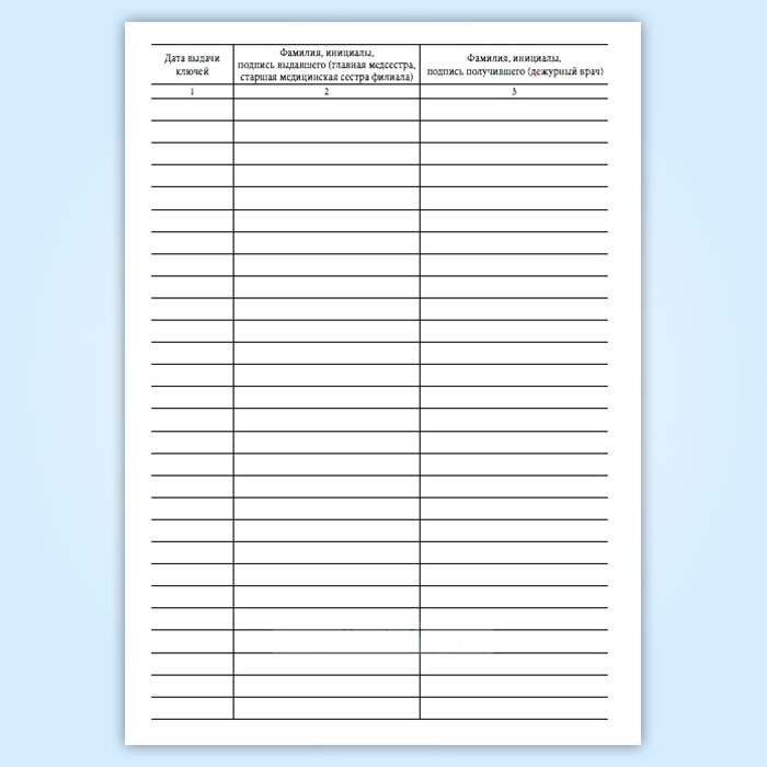 Журнал передачи ключей главной медсестры (старшей медицинской сестры филиала) дежурным врачам от помещения и сейфа, где проводятся операции, связанные с оборотом наркотических средств и психотропных веществ, в выходные и праздничные дни в амбулаторном отделении медицинской организации в Хотьково купить